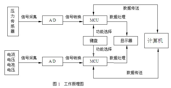 压力模块采用瑞士KELLER公司生产的高精度传感器,产生0~100mV的模拟电压信号,传送给信号处理单元后转换成数字信号,再由MCU作高精密的数据处理、计算,最后将结果送主机显示器显示及通过通讯端口传送给计算机。此设计大大减小了信号传输过程中的干扰以及放大电路所产生的放大误差,从而提高了测量精度。数据处理采用分段计算方法,可以弥补传感器本身的非线性误差。
